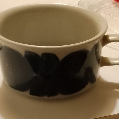 Myydään Ulla Procopen suunnittelemat Arabian käsinmaalatut ja signeeratut (yhdestä puuttuu signeeraus) Anemone-teekupit. Tuotannossa 1962-76. Halkaisija 10 cm ja korkeus 5,5 cm. Konepesun kestävät ja hyväkuntoiset, yhdessä pieni lohkeama. Hinta per kuppi.