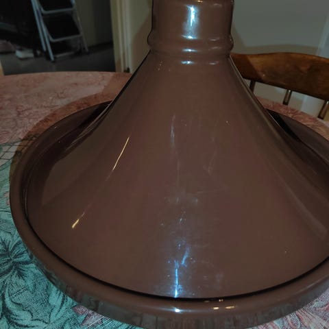 Tagine/tajine padan halkaisija 22 cm, korkeus (ilman kantta) 6 cm. Kannen erityisen muotoilun vuoksi todella hyvä haudutuspata.