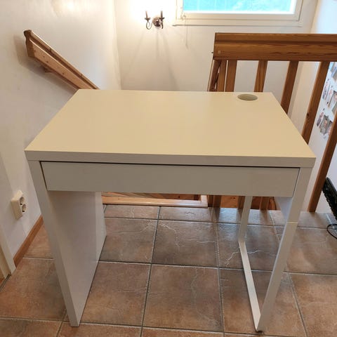 Myynnissä musta Ikean Micke-työpöytä ja pyörillä oleva laatikosto
