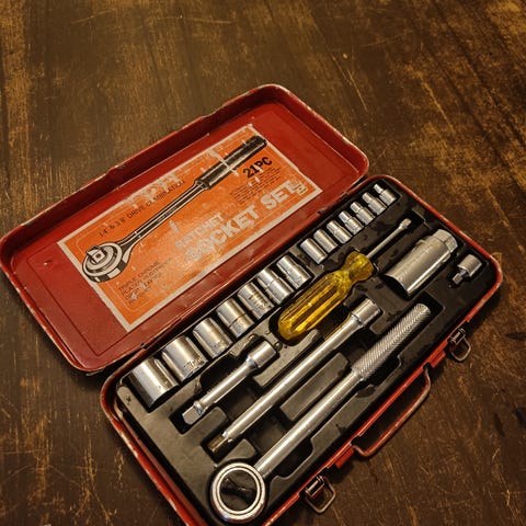 Vanha iso hylsysarja. Valmistettu Länsi-Saksassa. Uskoisin että varsin kestävä sarja. Yksi jatkovarsi puuttuu. 20mm hylsy lyhennetty. Pesty ja toimivuus testattu.
