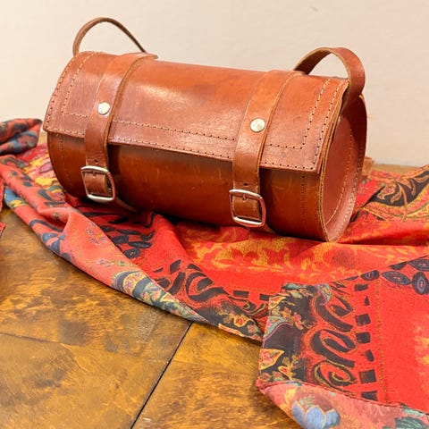Konjakinruskea nahkainen vintage satulalaukku. Sisällä kaksi isompaa osiota joiden välissä vetoketjullinen tasku. Etuläpän alla lisäksi nepparilla suljettava tasku. Olkahihna pitkä ja säädettävissä. Laukku on käytetty ja nahassa paikoin pientä kulumaa, näkyy kuvissa, mutta edelleen hyvässä kunnossa, siisti ja ehjä sekä hajuton.