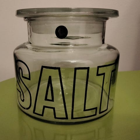 Lasipurkki punaisella metallikannella. Todennäköisesti Riihimäen lasin. Kannen sisäpuolella hieman ruostetta ja kulumaa.