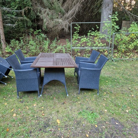 Rottinkinen parvekeryhmä. Sopii parvekekäyttöön ja ulkotiloihin. Ostettu n. vuosi sitten sotkasta. Pöytä, jossa lasinen levy.
