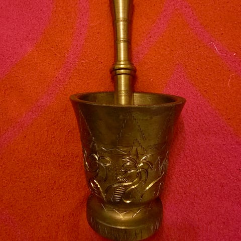 Kuparinen mortteli ja survin. Morttelin ja survimen materiaali kupari. Käytetään mausteiden ja yrttien murskaamiseen ja sekoittamiseen keittiössä. Korkeus 12 cm, halkaisija 9 cm . Survin 20 cm.