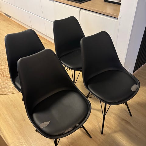 Harmaat tuolit, kangasosat siistissä kunnossa. Jaloissa jonkin verran naarmuja. Yhdestä tuolista toinen puoli selkänojasta antaa periksi, ollut kuitenkin käytössä tähän asti. Etusijalla mahdollisimman nopeat kaupat, nouto Tuirasta