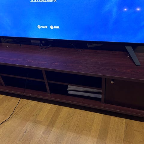 Kiiltävän musta tv-taso. Leveys 180, syvyys 41, korkeus 49. Käytönjälkiä saattaa löytyä. Reunoilla vedettävät laatikot, keskellä 3 hyllyä luukkujen takana. Keskellä takana aukko johdoille. Tv/irtotavara ei kuulu kauppaan. Vain nouto.