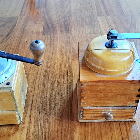 Antiikkinen kahvimylly ja kahvin paahdin. Tästä kahvihifistelijälle vimosen päälle kova setti mitä kallion kovimmatkin baristat kadehtii. Molemmat värkit pyörii kun kammesta kääntää, eli ei ole ruostunut kiinni, mutta muuten toimintaa ei ole testattu. Mylly erikseen 45€ yhdessä paahtimen kanssa 40€.