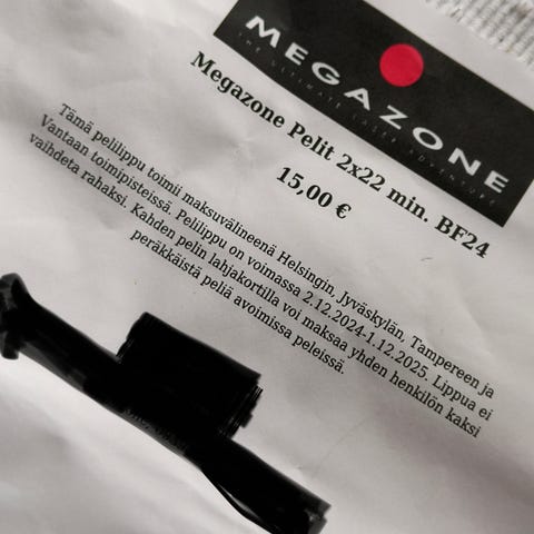 Kaksi Megazone pelilippua, jotka molemmat sisältävät kolme peli-istuntoa, joiden kesto on 22 minuuttia kukin. HUOMAA: VIIMEINEN KÄYTTÖ PÄIVÄ 24.12.2025!