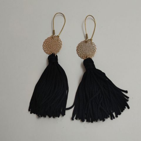 Hapsukorusetti: kaulakoru ja yksi korvakoru koukulla. Mustat hapsut. Kaulakorussa hapsun pituus keskeltä 23 cm. Korun istuvuutta kaulalla voi säätää tiukemmaksi ja löysemmäksi. Moitteeton kunto.