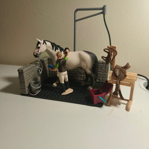 Myydään Schleich pesupaikka, mukana hevonen, pesijä, satulateline, loimi, riimu, vesiämpäri. Hyväkuntoisia.