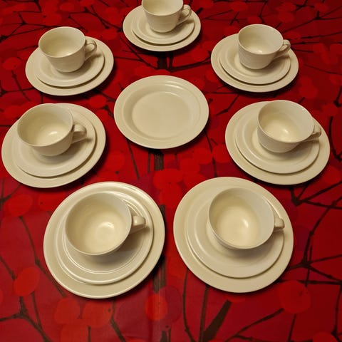 Sisältää 6 kahvikuppia ja niihin tassit. Kermakko ja sokerikko sekä 4 pullalautasta.