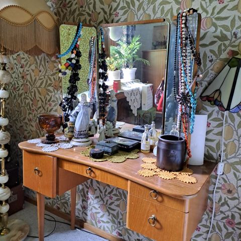 Suhteellisen siisti 50-luvun peilipöytä. Käytön jälkiä on.