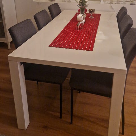 Hyvin pientä käytön jälkeä. Nurkat ja kulmat ehjät. Kahdessa jalassa sisäpuolella tuolista painaumia