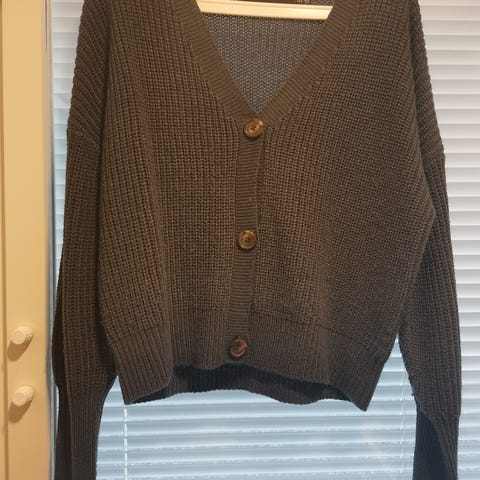 Vero Modan tyköistuva v-kauluksinen neuletakki 3/4 hihoilla. Erittäin joustavaa materiaalia (viskoosi-nylon). 3 nappia edessä. Rinnanympärys n. 82 cm, pituus olalta n. 57 cm.