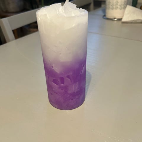 Punainen pöytäkynttilä, joka on pakattu kirkkaaseen muovikelmuun. Kynttilä on pyöreä, ja siinä on uurteita. Sopii sisustukseen tai valaistukseen.
