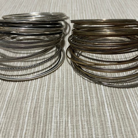 Punaisia ja mustia ohuita metallisia rannerenkaita 43 kpl. Moitteeton kunto. Myydään yhteishintaan.