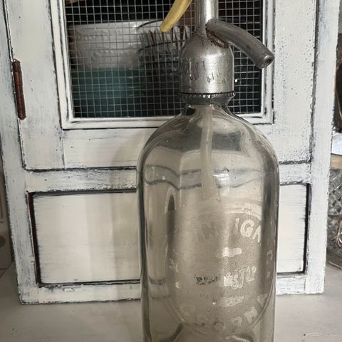 50-luvulta sifonipullo metalliverkolla