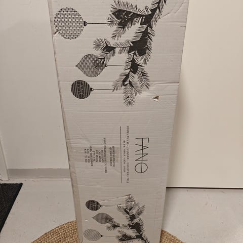 Kuvan valkoinen joulukuusi, korkeus 180 cm. Mukaan voi ostaa kuvan kuusen koristeet 18 kpl + 10€. Koiratalous, haku Oulusta.