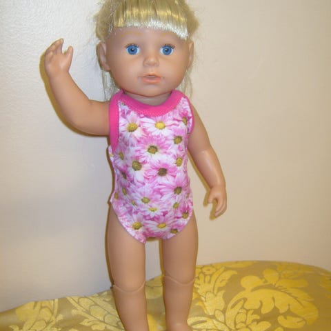 43 cm nukelle (baby born tai sister) trikoosta sydänkuvioinen uimapuku. Edestä ja takaa samanlainen. Helppo pukea, pääntieröyhelössä kuminauha.