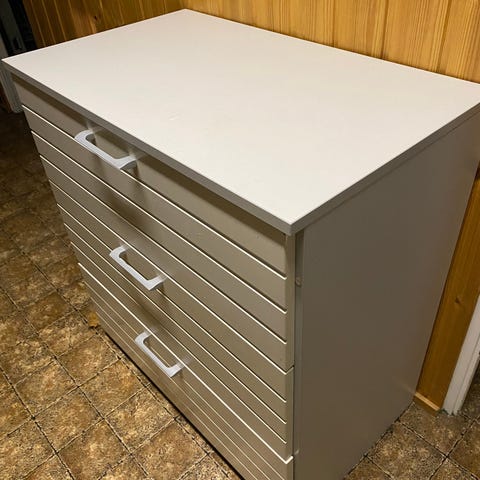Kuvanmukainen lipasto, täyspuuta, lakattu, mahinginruskea väri; iästä ei tietoa, mutta sukulaisella ollut pitkään (ja jäämistöstä tullut hänelle), mitat: leveys n. 87 cm, syvyys 45 cm, korkeus 76 cm.