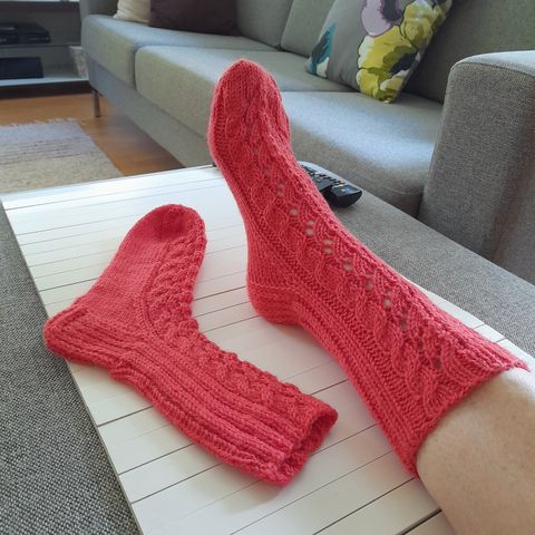 Villasukkia, varret polveen saakka. Väreinä beigeä ja vaaleanpunaista sekä tumman ja vaaleanharmaata.