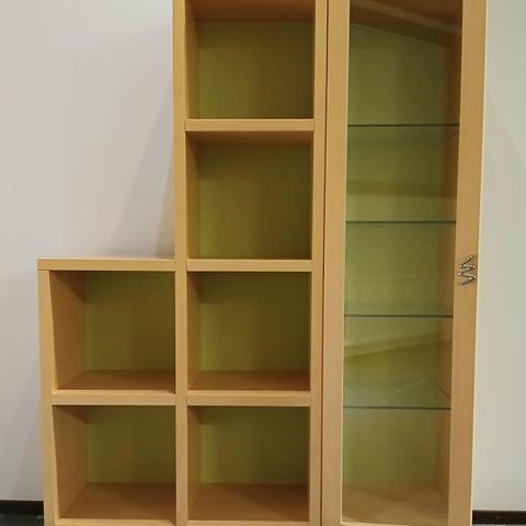 Puusepän tekemä säilytyskaappi, jossa on liukuvat lasiovet ja puuovet. Kansi mustaa lasia, kaappi vaaleanruskea.
