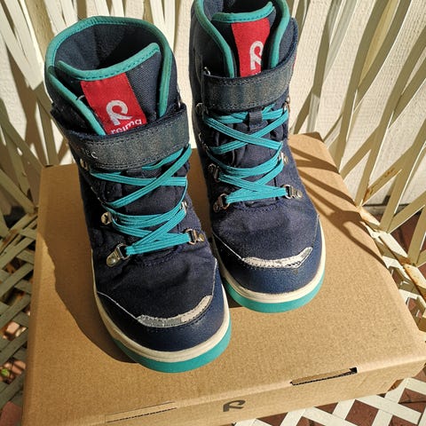 Reima Quicker talvikengät kokoa 34. Ok kuntoiset käytetyt. Toisen kengän sivussa vähän kangas nirhaumaa, mutta ei läpi. Tarrat pitää ja muutenkin kelpo kengät.