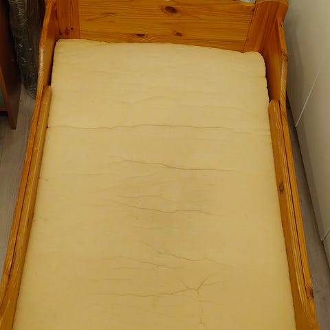 Puinen jatkettava sänky seuraavalle nukkujalle. Patjaa ei valitettavasti ole.