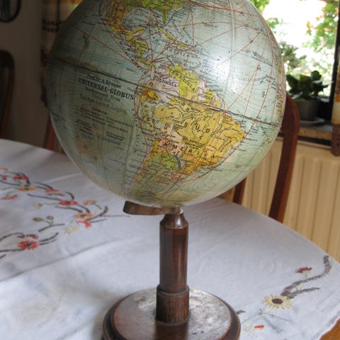 Pyörivä karttapallo, jossa on puinen kolmijalkainen jalusta. Jalusta on pyöreä ja tukee karttapalloa keskeltä. Ostettu aikoinaan antiikkiliikkeestä.