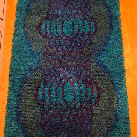 Hyväkuntoinen seinäryijy, koko 106cm × 150cm.