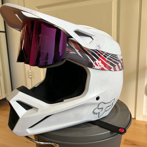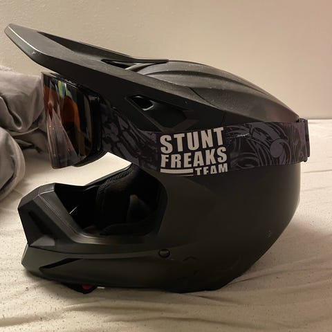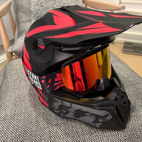 Stunt Freaks moottoripyöräkypärä ja suojalasit mustassa ja punaisessa värissä. Lasit kuuluu settiin, myös stunt freaksin. Kypärässä muutama pieni naarmu päällä. Mutta kypärää ei ole koskaan pudotettu tms. Kaupan päälle saa stunt freaksin kypärä suojan.