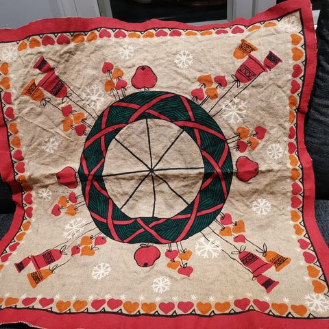 Kuusenalusmatto, halkaisija n. 1m. Itse tehty. Kangas puuvillaa (uutta, ei käytettyä), välissä vanu. Pohjakangas Marimekon "Pentu" kangas (ollut verhona) . Hinta 25€.
