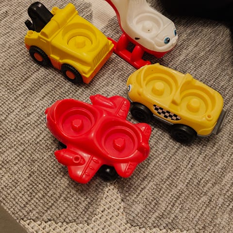 Koulubussi (äänet ja valot toimii), helikopteri, ambulanssi ja poliisiauto. Ja kaikki näihin kuuluvat kuskit.