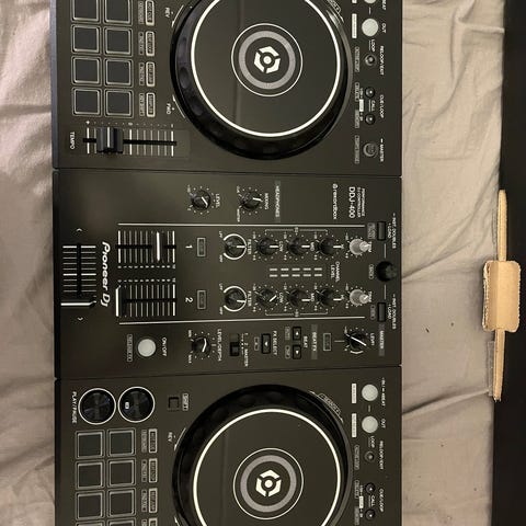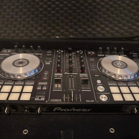 Pioneerin DDJ Ergo. Hyvä aloittavalle harrastelijalle. Mukana usb ja sähköpiuha.