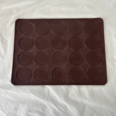 Lékuén laadukas leivontamatto / leivonta-alusta macaronien leivontaan. Alustassa on 48 pyöreää, macaroneille mitoitettua ”koloa”, joihin voi lusikoida tai pursottaa macaron-massaa. Jokaisessa kolossa on sisäkkäin kaksi ympyrää, ja massaa pursotetaan / lusikoidaan pienempään sisäympyrään, jolloin taikinalle jää sopivasti leviämisvaraa uunissa ulkoympyrän reunoille saakka. Näin kaikista macaroneista tulee saman kokoisia. Maton mitat n. 30 cm x 40 cm, väri suklaanruskea. Yhden ympyrän halkaisija n. 4 cm. Matto kestää konepesun ja lämpötiloja välillä -60° – +220°C. On käytetty ehkä kerran, joten on erittäin siistissä kunnossa, lähes kuin uusi. Hinta 15€. Nouto Espoo / Helsinki (esim. Kauklahti / Lippulaiva / Espoontori / rautatieasema / Kamppi). Voin myös postittaa, jolloin postituskulut lisätään hintaan. Tori-diili tai tavalliset kaupat.