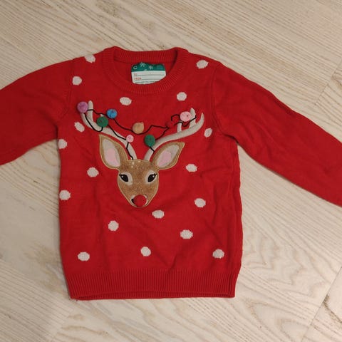 Lupilu joulupaita. Poron nenää painaessa paita soittaa musiikkia ja valot nenässä alkavat vilkkua. Tässä on jo vähän nyppyä pinnassa, mutta hyvin ajaa vielä asiansa.