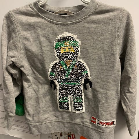 Lego-aiheinen kääntöpaljetti collegepaita, merkki H&M. Koko 98-104. Pidetty maks kerran, joten erinomainen kunto. Miellyttävä ja pehmeä sisäpinta. Väri tummanharmaa/musta.