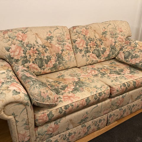 Kahden istuttava vuodesohva kukkakuviolla. Sängyn runko metallinen. Sänky käytännössä käyttämätön.