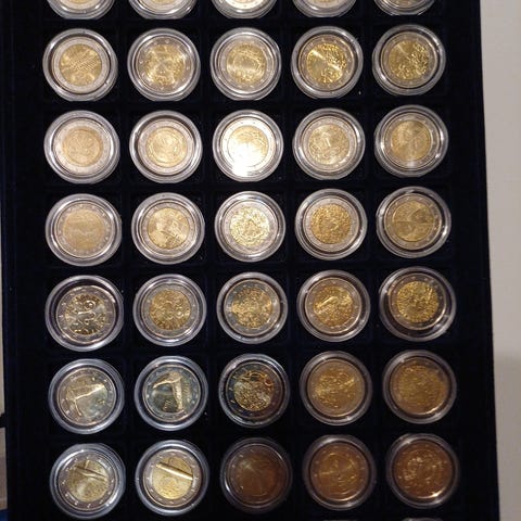 Myynnissä iso kokoelma 2e juhlarahoja.