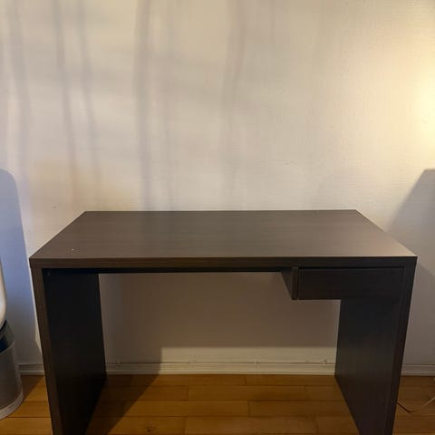 Vähän jo elämää nähnyt työpöytä. Pientä jälkeä tasossa ja taso vähän notkolla.