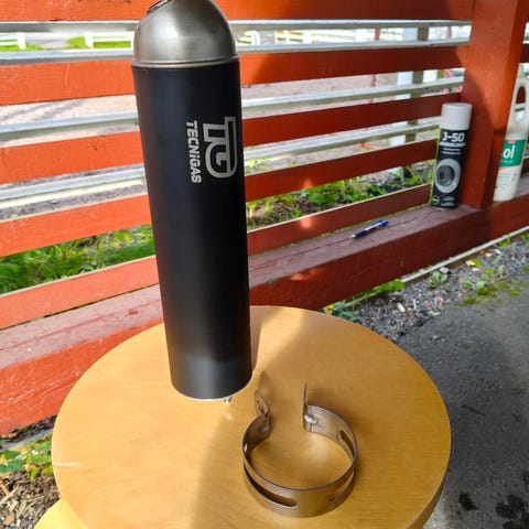 Enoxin äänenvaimennin. Ollut käytössä jonkun aikaa mutta nyt jäi hyllyyn. Kunto on ihan ok. Maalasin itse keväällä tuon keskikohdan mustaksi uudestaan lämmönkestävällä. Saa tarjota vähän jos tuntuu.