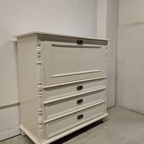 Nätti 50-luvun kirjoituslipasto myytävänä. Pinta aikanaan maalattu. Maalissa muutamia kolhuja. Yleisilme ikäisekseen siisti. Runko kaikin puolin ehjä ja tukeva. Ulos vedettävä taso, jonka alla lokerot ja peili. Ei hajuja.