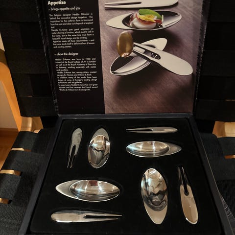 Georg Jensen Gense tarjoilu- alkupala-astiat neljä pikkulautasta haarukkaa ruostumattomasta teräksestä. Sama Etzyssä (käytettynä!) 166 e