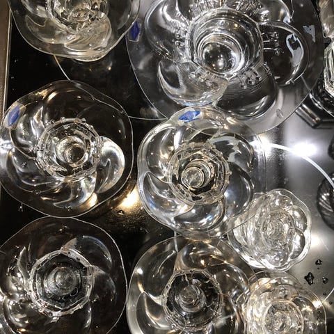 Eli 7 kpl Nuutajärven lasin valmistamia tuhka astioita. Pyöreä isoin näistä sinistä lasia täysin ehjä. 6 kappaletta pieniä kala tuhka astioita joista kaksi kappaletta kirkasta lasia, 2 kpl vihreää lasia ja 2 kpl tumman lila. Muutamassa kalassa pieni kolhu jotka näkyy kuvissa. Kala on Nuutajärven lasin logon mallinen. Pyöreän halkaisija 8 cm. Kalojen pituus 8.5 cm ja leveys keskeltä 5 cm. Nyt ei ole hinnalla pilattu könttä hintaan kaikki.