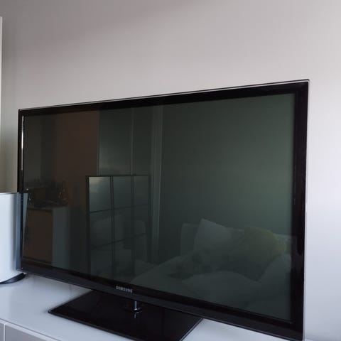 Hyvällä kuvalaadulla varustettu plasma-TV. Kaukosäädin toimii.