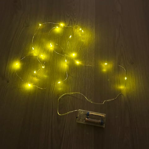 Kotikulta punainen pieni led-valosarja. Pituus noin 1,9 m. Sopii esimerkiksi lasikuvun tai muun kirkkaan lasisen astian sisälle tuomaan valoa. Toimii kahdella AA-paristolla. Myydään ilman paristoja.