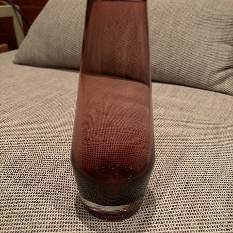 Riihimäen lasin valmista ja Sakari Pykälän suunnittelema lila kaadin. Kaadin ehjä mutta siinä isompi ilmakupla/valu jälki ja tämä huomioitu hinnassa. Melko harvinainen kannu. Kannun korkeus 22 cm.