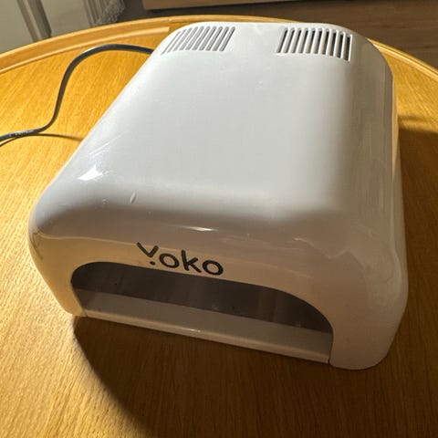 Toimiva uv-kynsiuuni geelilakkojen kovettamiseen. Start nappula on tipahtanut pois, mutta saa silti laitettua päälle. Pitkä sähköjohto!