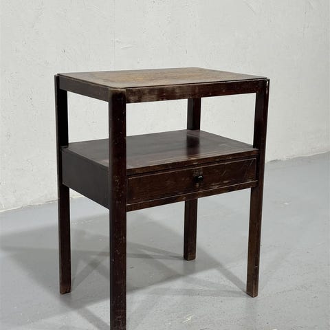 Kompakti vintage 60-luvun hyllykkö. Siinä on kaksi avointa hyllyä ja kaksi vetolaatikkoa alhaalla, mikä tarjoaa runsaasti säilytystilaa. Hyllykön yksinkertainen muotoilu ja puun luonnollinen sävy tekevät siitä monikäyttöisen kalusteen moneen tilaan.60-luvun tyyli on tunnistettavissa hyllykön suoraviivaisista linjoista ja funktionaalisesta muotoilusta. Tämä aikakausi tunnetaan käytännöllisyydestään ja minimalistisesta estetiikastaan, mikä näkyy myös tässä hyllykössä.Hyllykössä on näkyviä kulumisen jälkiä, kuten naarmuja ja pieniä kolhuja.