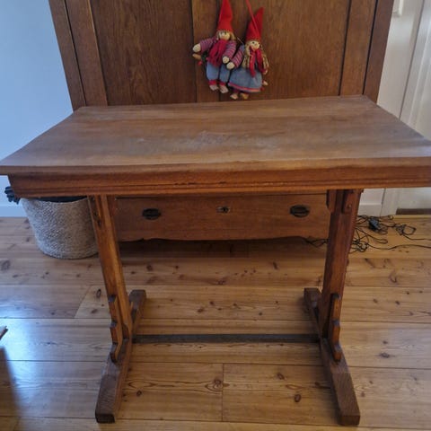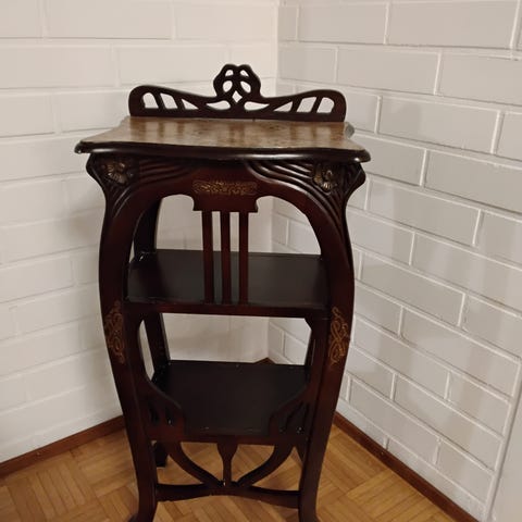 Vintage talonpoikais sivupöytä. Pöydän pyöreä muoto ja koristeelliset jalat tekevät siitä erottuvan esineen mihin tahansa tilaan. Pöydän ruskea sävy korostaa sen klassista ilmettä.Talonpoikaistyyli on tunnettu yksinkertaisuudestaan ja käytännöllisyydestään, ja se on ollut suosittu erityisesti maaseudulla. Tämä pöytä edustaa hyvin kyseistä tyyliä, ja se tuo mukanaan ripauksen menneiden aikojen charmia. Valmistajaa ei ole tiedossa, mutta pöytä on selvästi käsityönä tehty.Pöydässä on näkyviä kulumisen jälkiä, kuten naarmuja ja pieniä kolhuja, jotka kertovat sen pitkästä historiasta.